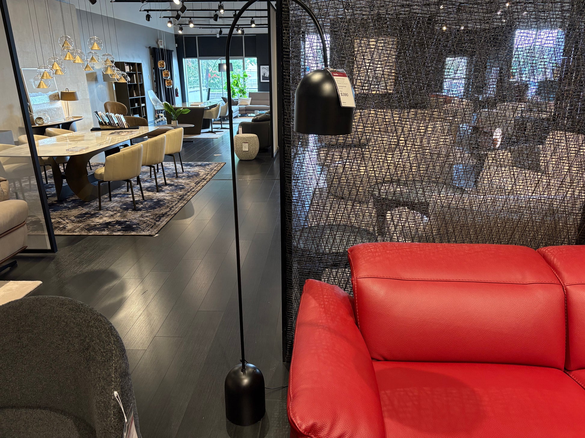 This black floor lamp is crook shaped and designed with curving modern style. With it's downward focused lampshade direction, this floor lamp makes for an excellent light source when reading on the couch!